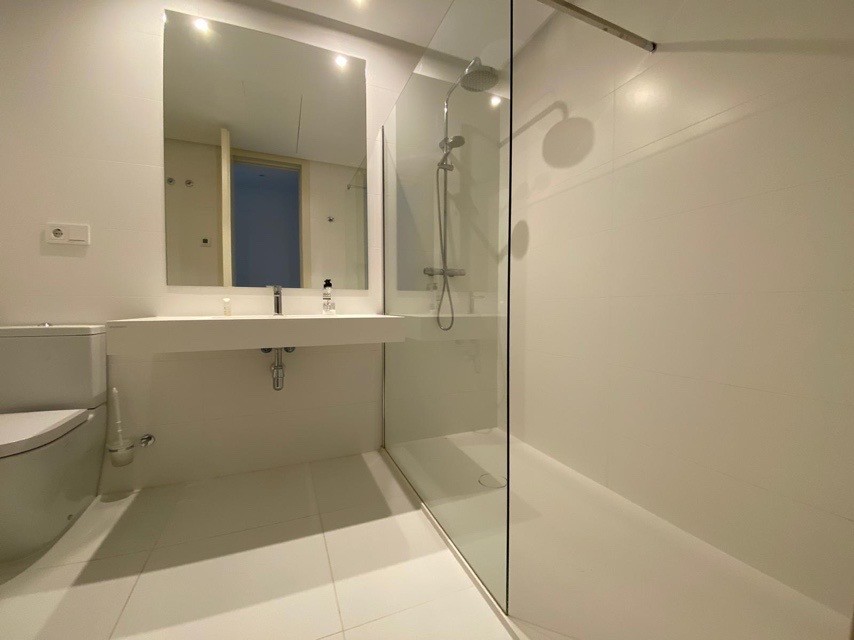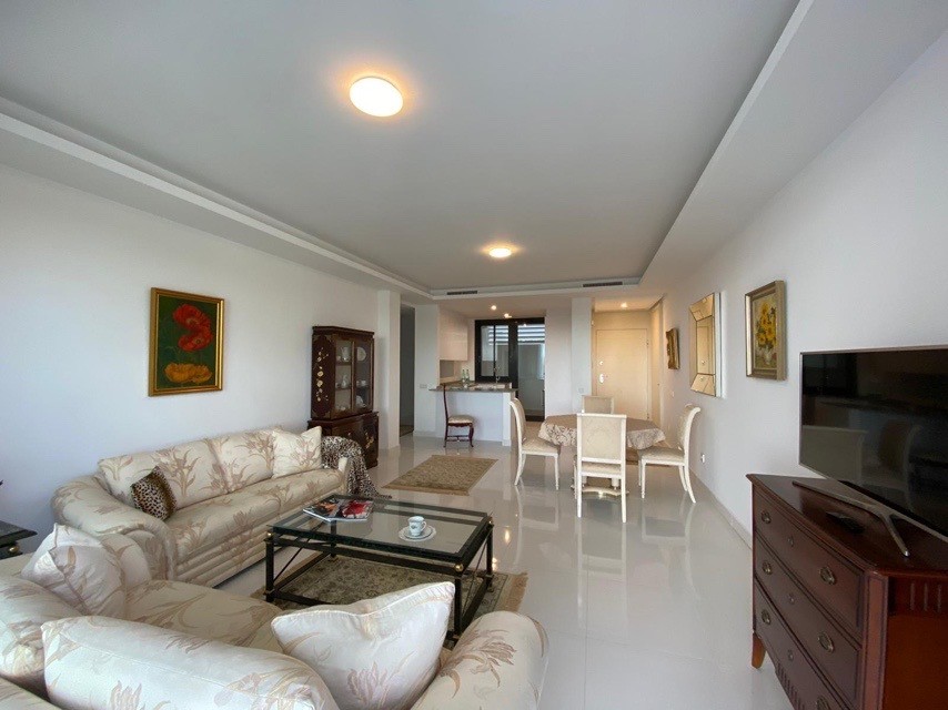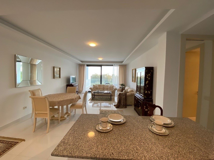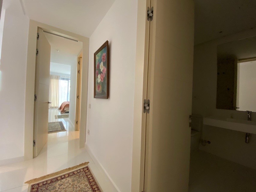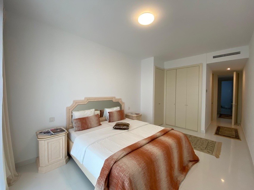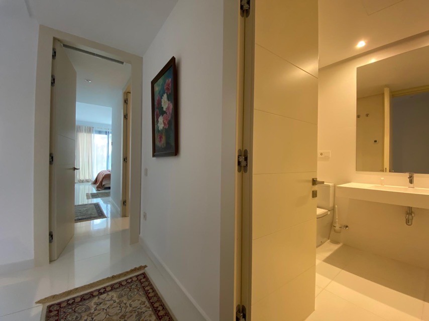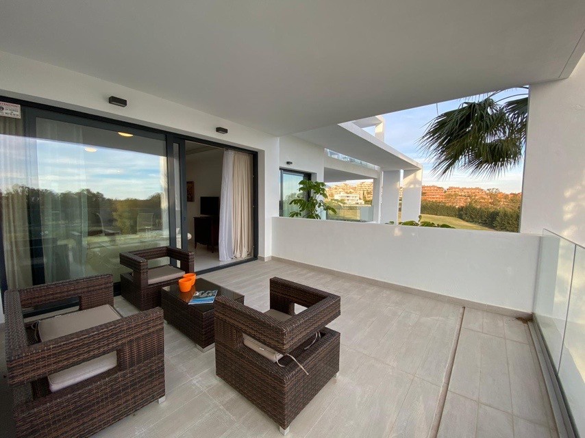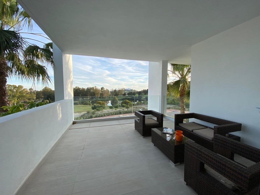 The apartment offers wonderful high ceilings, a large living room with dining area and open plan fully fitted kitchen with American breakfast bar. The living room leads onto a very large covered terrace with glass balustrade enjoying wonderful views to the golf course with lake, the green natural surroundings and down to the coast. Completely south facing this property boasts 2 bedrooms, the master with en-suite bathroom including Jacuzzi bathtub, lots of wardrobes and a large bedroom. The guest bedroom with twin beds also with fitted wardrobes and guest bathroom with large shower adjacent. A separate laundry room off the kitchen. The property boasts top quality finishes including air conditioning hot and cold, underfloor heating in the bathrooms and is extremely light and bright. A storage room and 1 parking space is offered with the property.